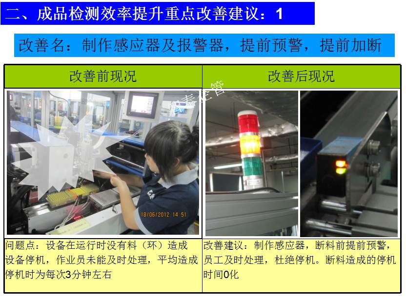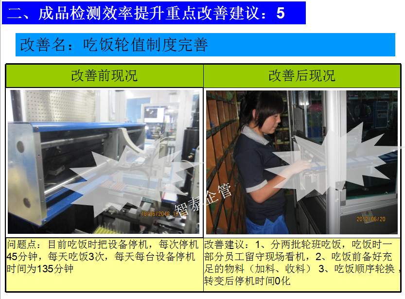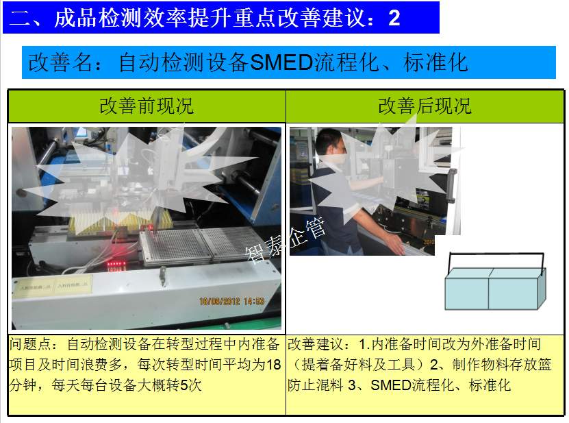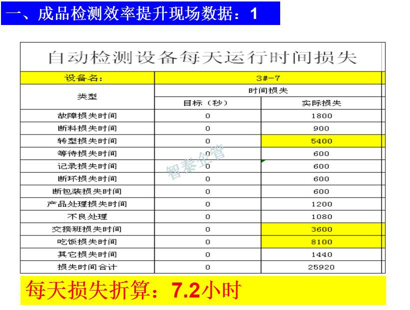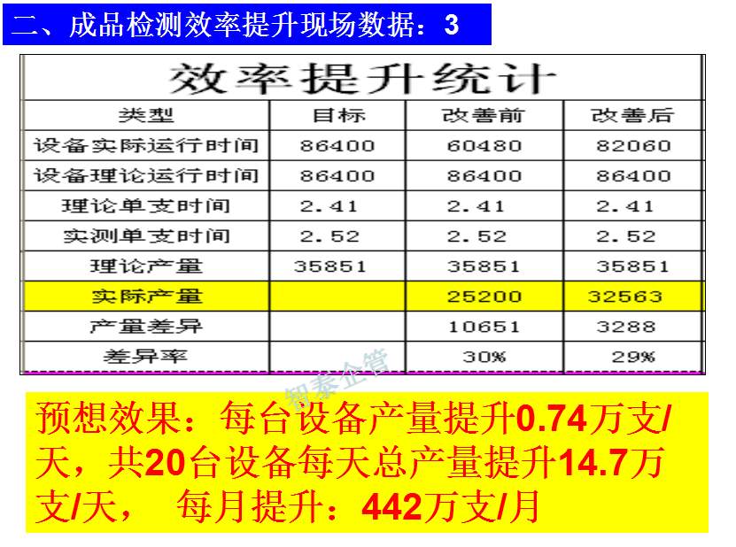 世界級(jí)制造及精益管理是智泰人一生追求的理想,智泰咨詢?cè)谄髽I(yè)推進(jìn)精益生產(chǎn)后平均生產(chǎn)效率提升35%以上,智泰專業(yè)團(tuán)隊(duì)為企業(yè)消除八大浪費(fèi),通過(guò)精益管理,提高企業(yè)的生產(chǎn)效率和產(chǎn)品質(zhì)量,持續(xù)推進(jìn)焦點(diǎn)課題改進(jìn)重大問(wèn)題,每年給企業(yè)帶來(lái)的收益平均有800萬(wàn)以上,附件為智泰咨詢顧問(wèn)團(tuán)隊(duì)為某企業(yè)生產(chǎn)效率提升的案例,請(qǐng)查閱:
