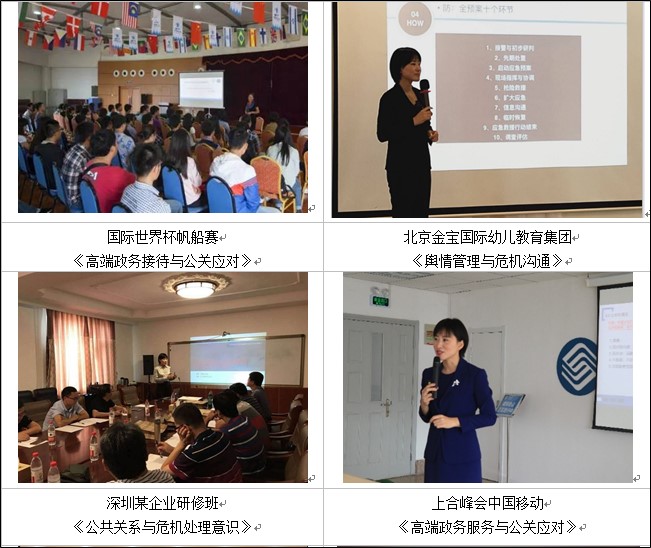 石慧老師擁有15年高級管理及企業(yè)公關(guān)管理工作經(jīng)驗,曾任職于世界500強企業(yè)擔(dān)任企業(yè)公關(guān)負責(zé)人,長期專注于危機公關(guān)、危機管理、媒體事件、突發(fā)事件應(yīng)急管理、領(lǐng)導(dǎo)人的公眾形象和高端商務(wù)政務(wù)客戶服務(wù)的研究和實踐,具有豐富的危機公關(guān)、媒體傳播、服務(wù)營銷培訓(xùn)和實戰(zhàn)經(jīng)驗,石老師吸收國內(nèi)外危機公關(guān)與國際商務(wù)禮儀理念,形成最符合中國企業(yè)在危機公關(guān)的應(yīng)對策略,幫助公關(guān)人員在應(yīng)對危機時,更能得體有效的應(yīng)對危機、化解危機,讓企業(yè)的品牌影響力更為有效的發(fā)揮。學(xué)員們都說石老師是目前在危機公關(guān)領(lǐng)域中難得的即懂得危機公關(guān)處理,又懂得國際禮儀的雙項講師,被譽為:危機公關(guān)老師中最懂國際商務(wù)禮儀,國際商務(wù)禮儀老師中最懂危機公關(guān)的老師“。石老師曾多次服務(wù)青島日報社、青島電視臺、青島人民廣播電臺、青島新聞網(wǎng)、《格調(diào)》高端雜志等國內(nèi)知名企業(yè)及媒體,足跡曾遍布國內(nèi)100余省、市,授課近500場次,學(xué)員近2萬人次,深受學(xué)員喜愛。