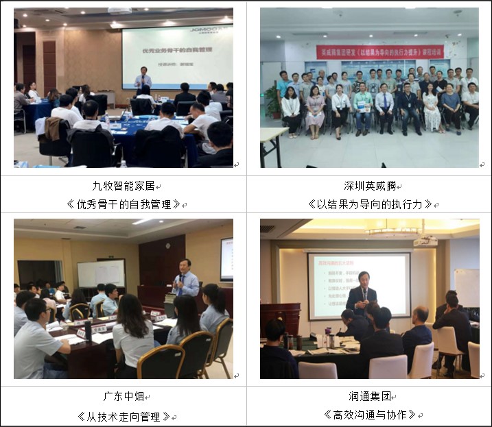 ★為家居建材十大壁紙品牌之一的浙江科翔壁紙講授《管理者核心技能提升》、《高效執(zhí)行力》、《自我管理》、《員工職業(yè)精神》、《高效溝通技巧》等一系列課程,2年時(shí)間為該公司各層級(jí)員工及經(jīng)銷商先后培訓(xùn)60多場(chǎng),學(xué)員參訓(xùn)人數(shù)達(dá)2000多人次,全面提升了該公司各級(jí)人員管理水平及綜合素質(zhì),深受公司及學(xué)員好評(píng)。后經(jīng)該公司轉(zhuǎn)介紹,先后為方太廚具、廣州海鷗衛(wèi)浴、福建九牧智能家居等公司培訓(xùn)相關(guān)系列課程。