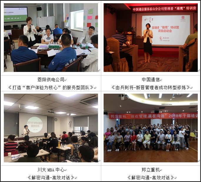 為銀行培養(yǎng)1200余名優(yōu)質服務人員及優(yōu)秀管理者:多次應邀為萬源農商行、涼山農商行、甘孜農商行、四川建行等進行《習贏職場-高效能人士的七把金鑰匙》、《服贏未來-服務意識與服務溝通實戰(zhàn)》《由兵到將-新晉管理者成功轉型修煉》等課程培訓,為銀行培養(yǎng)1200余名優(yōu)質服務人員及優(yōu)秀管理者,客戶滿意度達94%以上。