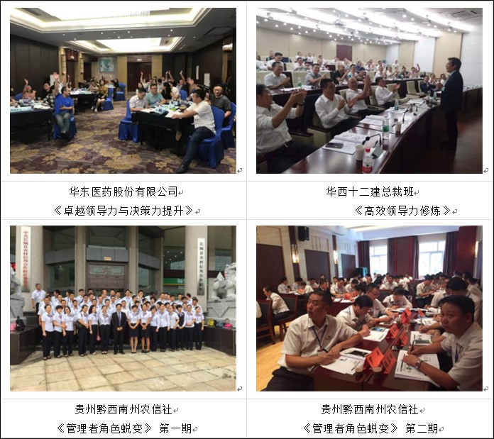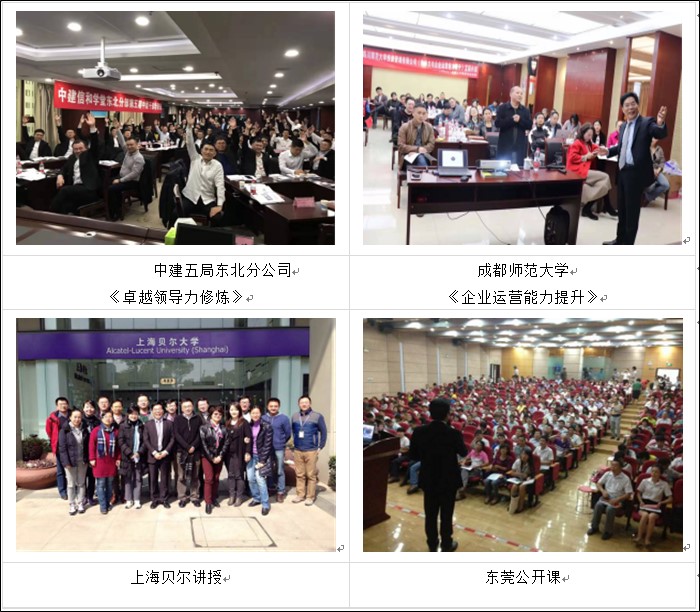 高校與政府機(jī)構(gòu):山西電力黨校、深圳清華大學(xué)研究院、清華大學(xué)PE總裁班、中山大學(xué)(MBA)廣州研究院、中山大學(xué)(MBA)江門研究院、西點(diǎn)執(zhí)行力學(xué)院、武漢大學(xué)經(jīng)管學(xué)院EDP、東莞黃岡貴族理想學(xué)校、深圳市學(xué)知文化、南昌財經(jīng)大學(xué)、上海交通大學(xué)、蘇州大學(xué)、新疆財經(jīng)大學(xué)、涼山州國資委……