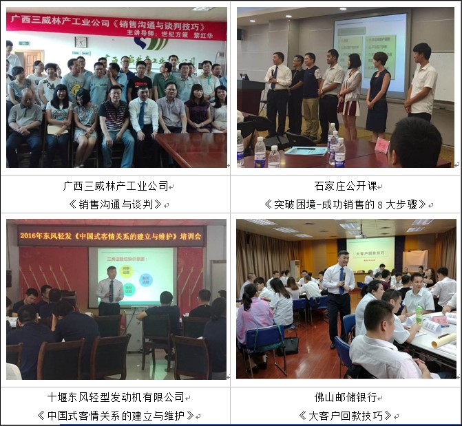 黎老師24年的營銷管理和培訓(xùn)生涯,積累了豐富的企業(yè)管理實戰(zhàn)和顧問經(jīng)驗,授課方式新穎獨特,重視與學(xué)員間的互動、交流來啟發(fā)學(xué)員,使學(xué)員在視覺、聽覺、觸覺、思維模式上形成多方位的感受,從而使之產(chǎn)生體驗;并將理論與實戰(zhàn)、認知與實踐相結(jié)合,重視激發(fā)學(xué)員思維內(nèi)在視角,啟迪團隊靈性及感悟智慧,其博取眾長,形象生動的授課風(fēng)格,幽默和極富感染的表達力,營造了一個個活潑有趣的培訓(xùn)課堂,充分激發(fā)了學(xué)員的潛能,使參訓(xùn)者的專業(yè)知識和技能在較短的培訓(xùn)時間內(nèi)得到了升華,深受客戶的歡迎和好評。