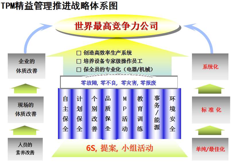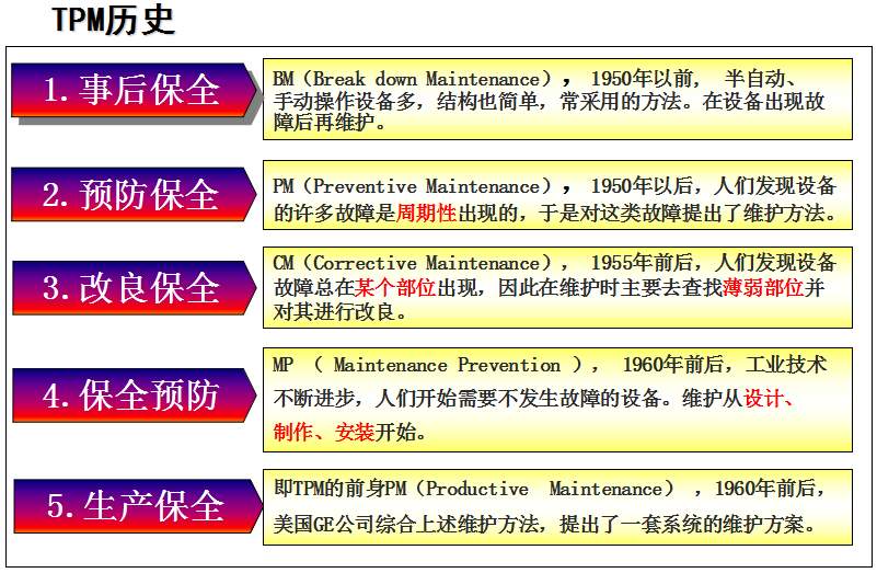 TPM咨詢公司中對于TPM管理的解釋是英文Total Productive Maintenance的縮略語,中文譯名叫全員生產(chǎn)維護,又譯為全員生產(chǎn)保全:《T (Total)全員 所有部門全員參加的意思;P (Productive)生產(chǎn) 效率提升追求故障 0 化, 不良 0 化, 災(zāi)害 0 化,浪費 0 化;M (Maintenance)維護(保全) 追求極限效率為目的生產(chǎn)體系維持理想狀態(tài)的活動》。這是日本人在70年代提出的,是一種全員參與的生產(chǎn)維護方式,其主要點就在“生產(chǎn)維護”及“全員參與”上。通過建立一個全系統(tǒng)員工參與的生產(chǎn)維護活動,使設(shè)備性能及員工綜合技能達到最優(yōu)。TPM咨詢管理的提出是建立在美國的生產(chǎn)維護體制的基礎(chǔ)上。在非日本國家,由于國情不同,對TPM的理解是:利用包括操作者在內(nèi)的生產(chǎn)維護活動,是以提高OEE(設(shè)備綜合效率)為目標,以全系統(tǒng)的預(yù)防維護為過程,全體人員參與為基礎(chǔ)的設(shè)備保養(yǎng)和維護管理體系。