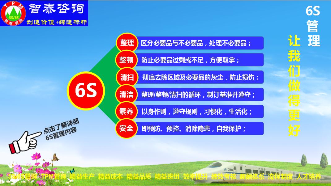 智泰咨詢公司在企業(yè)推進(jìn)6S管理中,為了確保6S管理能夠快速展開并結(jié)出成果,還會(huì)導(dǎo)入其它的管理工具來(lái)輔助6S管理的推進(jìn)。以下是各個(gè)管理工具的簡(jiǎn)介。