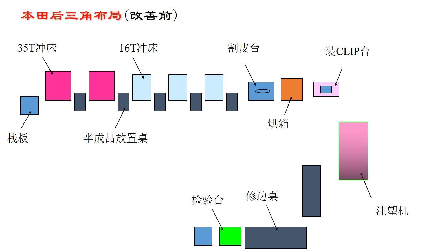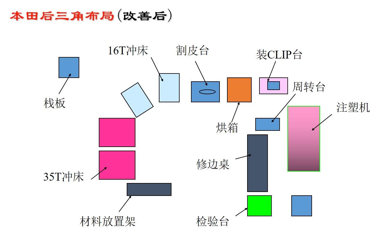 在一些工廠中經(jīng)??梢钥吹?,不同工序的加工設(shè)備之間的距離非常遠(yuǎn),搬運(yùn)到下一道工序,這樣的現(xiàn)象被稱為孤島設(shè)備。“一個(gè)流”生產(chǎn)要求放棄按設(shè)備類型排列的布局,而是按照加工順序來排列生產(chǎn)設(shè)備,避免孤島設(shè)備現(xiàn)象的出現(xiàn),盡可能使設(shè)備的布置流水線化,真正做到只有“一個(gè)流”。