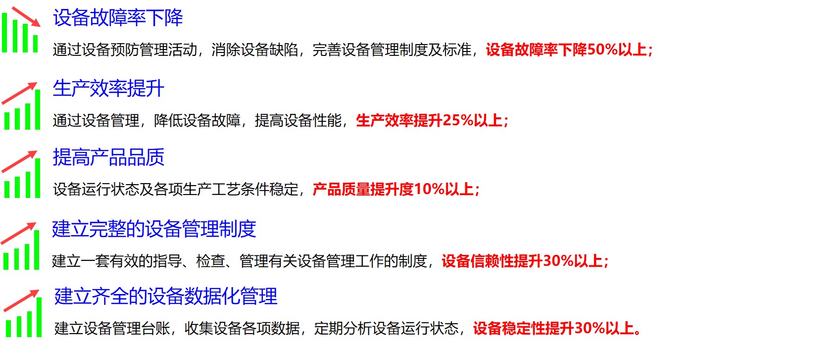 生產(chǎn)效率提升50%以上;產(chǎn)品質(zhì)量提升度30%以上;生產(chǎn)經(jīng)營成本下降10%以上;設(shè)備故障率下降70%以上---確保成為行業(yè)標(biāo)桿和最高競爭力企業(yè)。